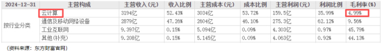 根本原因在于,工业富联的云计算业务还没有完全撕掉“组装”的旧标签。2024年,公司云计算业务毛利率仅4.99%,对比同样以电子产品组装出名的立讯精密,也差了一大截。