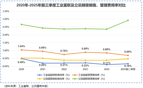 2025年前三季度,工业富联管理费用率从之前的1%下降至0.69%,差不多是立讯精密管理费用率的五分之一。