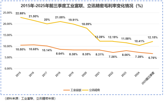 2015年-2025年前三季度,工业富联的毛利率从10.5%下降到6.76%,让本就单薄的盈利能力雪上加霜。