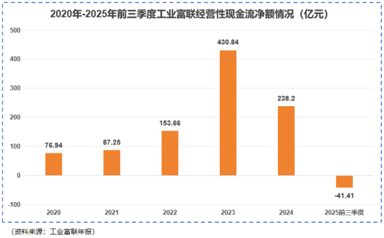 2025年前三季度,工业富联经营活动现金流量净额直接从原来的238.2亿下滑至-41.41亿元。经营现金流是企业为维持日常经营需要而留在账上的现金,被称为企业的“生命线”。当这个数字转为负值时,往往意味着公司运营出现了某种紧张局面。