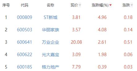 其中,ST新城、华丽家族、万业企业、光大嘉宝、格力地产位列板块涨幅前五位,涨幅分别为4.96%、4.08%、2.61%、1.98%、0.39%。
