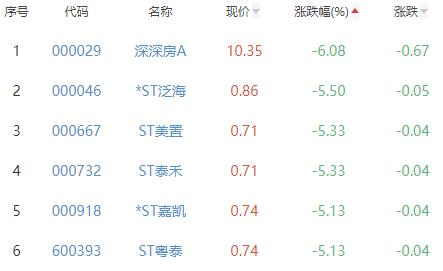 深深房A、*ST泛海、ST美置、ST泰禾、*ST嘉凯、ST粤泰位列涨幅榜后五位,涨幅分别为-6.08%、-5.50%、-5.33%、-5.33%、-5.13%、-5.13%。
