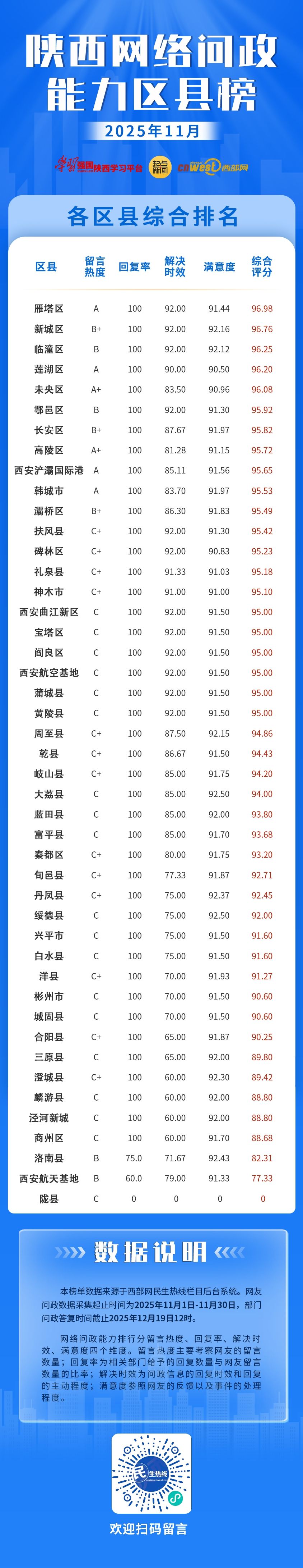2025年11月,西部网民生热线与陕西45个区县(开发区)进行了网络问政沟通对接。根据各区县(开发区)留言热度、回复情况和网友满意度的综合评定,西安雁塔区、西安新城区、西安临潼区分别以总分96.98、96.76、96.25位列网络问政能力11月区县榜前三名。
