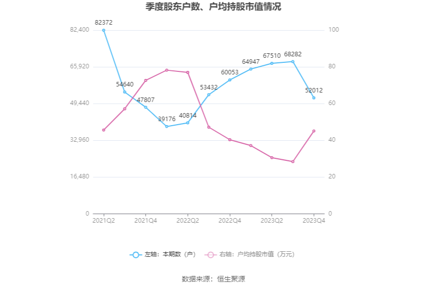 筹码集中度方面,截至2023年年末,公司股东总户数为5.2万户,较三季度末下降了1.63万户,降幅23.83%;户均持股市值由三季度末的28.41万元上升至45.11万元,增幅为58.78%。