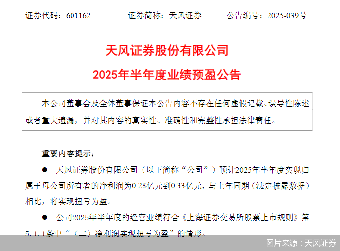天风证券:预计上半年归母净利润为0.28亿—0.33亿元,同比将扭亏为盈