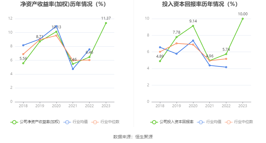 数据显示,2023年公司加权平均净资产收益率为11.37%,较上年同期增长4.91个百分点;公司2023年投入资本回报率为10.00%,较上年同期增长4.26个百分点。