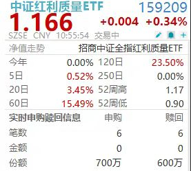 10月9日,高质量红利再发力。截至10时55分,表征板块的中证红利质量ETF(159209)放量涨0.43%,盘中冲击三连升;成分股西部矿业、山金国际、川恒股份涨幅居前;资金热度不减,据Wind Level2实时行,盘中再度净流入。