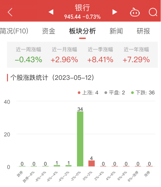 中国经济网北京5月12日讯 今日,银行板块整体跌幅0.73%,其中4只股票上涨,2只股票平盘,36只股票下跌。