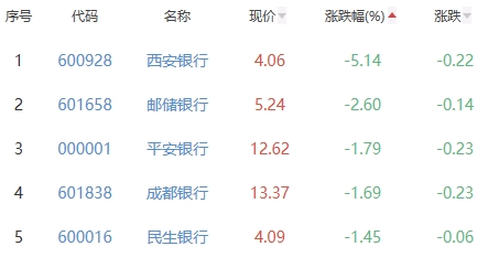 西安银行、邮储银行、平安银行、成都银行、民生银行位列涨幅榜后五位,涨幅分别为-5.14%、 -2.60%、-1.79%、-1.69%、-1.45%。