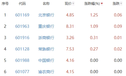 其中,北京银行、重庆银行、浙商银行、常熟银行、中国银行、渝农商行位列板块涨幅前五位,涨幅分别为1.25%、1.09%、0.31%、0.27%、0.00%、0.00%。
