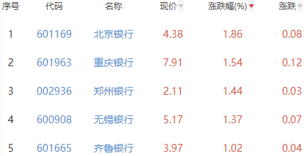 其中,北京银行、重庆银行、郑州银行、无锡银行和齐鲁银行位列板块涨幅前五位,涨幅分别为1.86%、1.54%、1.44%、1.37%和1.02%。