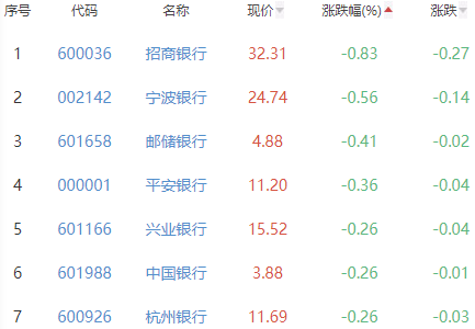 招商银行、宁波银行、邮储银行、平安银行、兴业银行、中国银行和杭州银行位列涨幅榜后五位,涨幅分别为-0.83%、-0.56%、-0.41%、-0.36%、-0.26%、-0.26%和-0.26%。