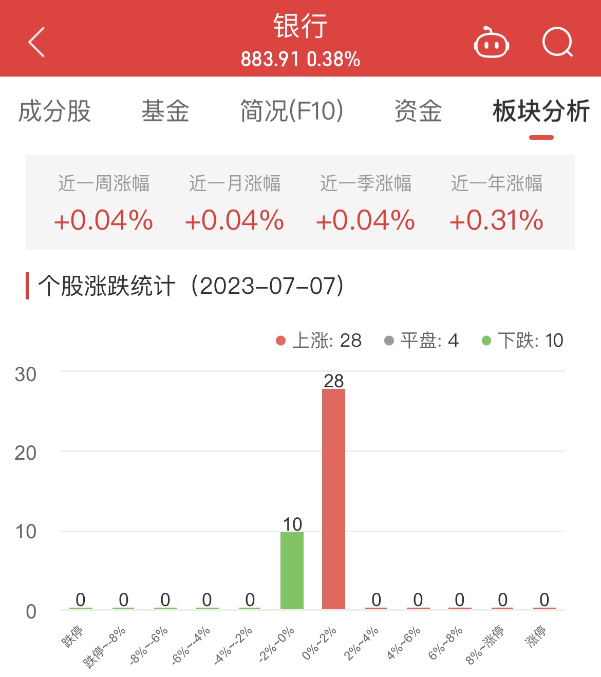 中国经济网北京7月7日讯今日,银行板块整体涨幅0.38%,其中28只股票上涨,4只股票平盘,10只股票下跌。