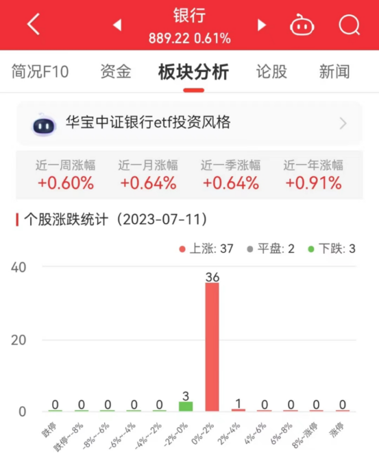 中国经济网北京7月11日讯今日,银行板块整体涨幅0.61%,其中37只股票上涨,2只股票平盘,3只股票下跌。