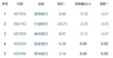 浙商银行、宁波银行、南京银行、张家港行、青岛银行位列涨幅榜后五位,涨幅分别为-0.38%、-0.20%、-0.12%、0.00%、0.00%。