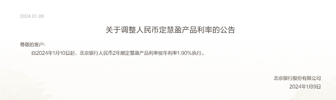北京银行:1月10日起,人民币2年期定慧盈产品年利率按1.90%执行