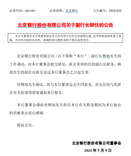 发布公告称,该行副行长韩旭因工作调动,向董事会提交辞呈,辞去其所担任的副行长职务。韩旭的辞任自辞呈送达该行董事会之日起生效。