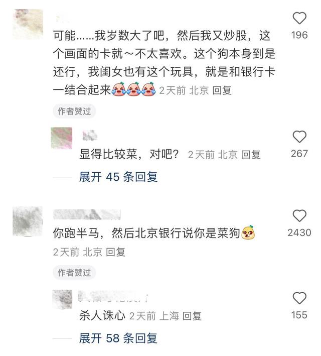 这篇帖子一经发出,引得不少网友围观,有网友道“你跑半马,银行说你是‘菜狗’”,也有网友被“反向种草”,觉得卡面图案很可爱,想立刻拥有。