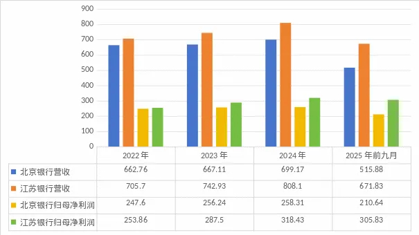 早在2022年,城商行老二江苏银行以705.7亿元的营收、253.86亿元的归母净利润水平,超过北京银行的662.76亿元、247.6亿元,首次实现盈利能力上的超越。