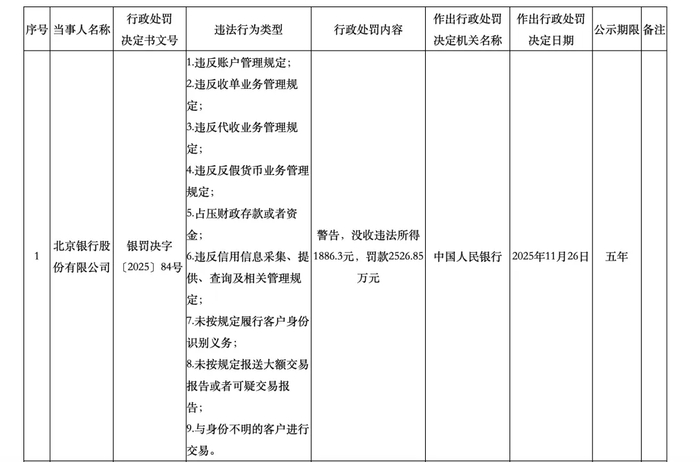 根据央行11月28日发布的行政处罚信息,北京银行因九大违法违规行为,被央行警告,并没收违法所得1886.3元,罚款2526.85万元,合计罚没2527万元。