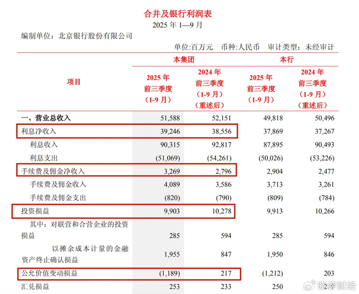 但在投资业务上,2025年前九月,北京银行的投资收益为99.03亿元,同比减少3.75亿元,下降3.6%;公允价值变动收益为-11.89亿元,较上年同期的2.17亿元减少14.06亿元,在三季度债市波动的背景下,投资业务反而成为北京银行业绩的拖累。