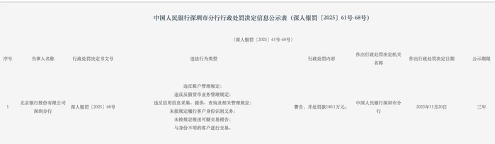 就在本次被罚数日前,11月20日,北京银行深圳分行因违反银行账户及支付结算管理规定被警告并罚款180.1万元。