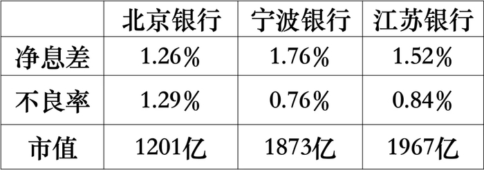 市值方面,截至11月28日收盘,江苏银行、宁波银行、北京银行A股市值分别为1967亿元、1873亿元、1201亿元。
