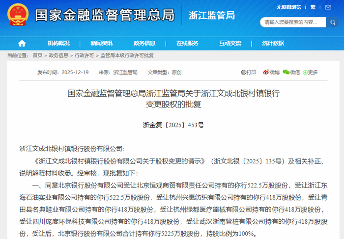 批复显示,同意北京银行股份有限公司受让北京恒观商贸有限责任公司持有的该行522.5万股股份,受让浙江东海石油实业有限公司持有的该行522.5万股股份,受让杭州兴惠纺织有限公司持有的该行418万股股份,受让青田县名典鞋业有限公司持有的该行418万股股份,受让杭州绿都医疗器械有限公司持有的该行418万股股份,受让四川庞度环保科技有限公司持有的该行418万股股份,受让武汉浙南管桩有限公司持有的该行418万股股份,受让后,北京银行股份有限公司合计持有该行5225万股股份,持股比例为100%。