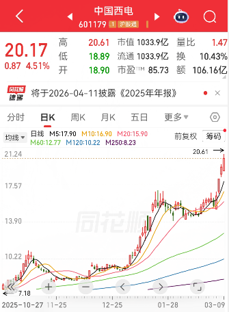 (601179)股价大涨4.51%,最新收盘价20.17元/股,创下历史新高,公司最新A股市值1034亿元,历史首次迈进千亿市值行列。