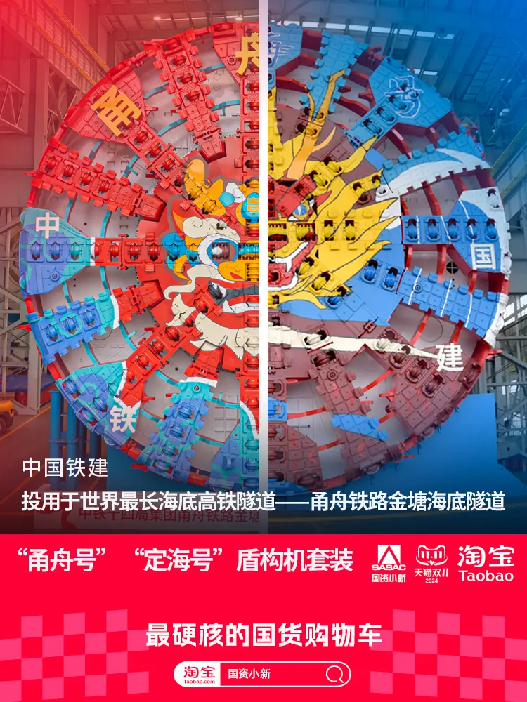 由中国铁建研制的“甬舟号”和“定海号”盾构机套装也于今年“双十一”亮相国资小新淘宝店,这组盾构机被应用于世界长度最长、直径最大的海底高铁隧道——甬舟铁路金塘海底隧道建设。