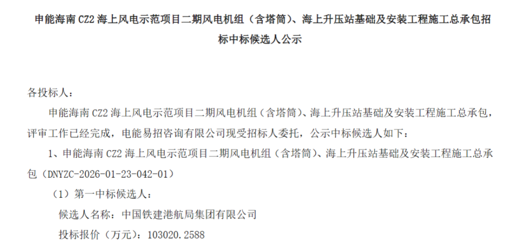 3月4日,国家电投电子商务平台发布《申能海南CZ2海上风电示范项目二期风电机组(含塔筒)、海上升压站基础及安装工程施工总承包招标中标候选人公示》的公告。
