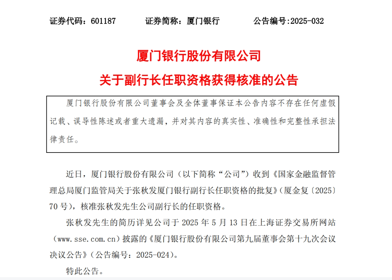 发布公告称,近日,公司收到《国家金融监督管理总局厦门监管局关于张秋发厦门银行副行长任职资格的批复》(厦金复〔2025〕70号),核准张秋发公司副行长的任职资格。