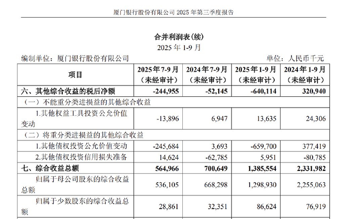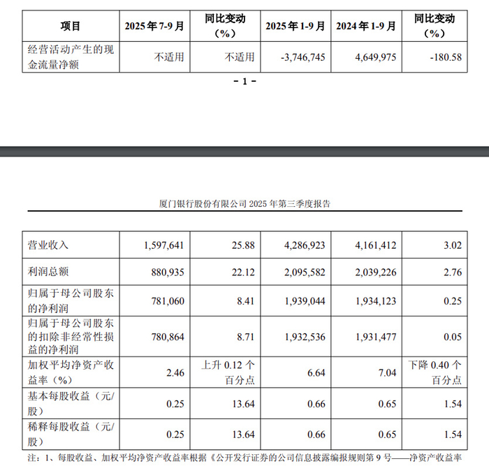 据公司10月30日披露的最新三季报显示,其前三季度实现营业收入42.87亿元,同比增长3.02%;归母净利润同比增长0.25%至19.39亿元,两项业绩增速指标双双由负转正。单看第三季度,厦门银行营收为15.98亿元,同比增长25.88%;归属于母公司股东的净利润为7.81亿元,同比增长8.41%。
