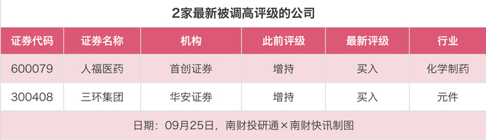评级调高方面,9月25日,券商调高上市公司评级达到2家次,最新数据包括了首创证券对人福医药的评级从“增持”调高至“买入”,华安证券对三环集团的评级从“增持”调高至“买入”。