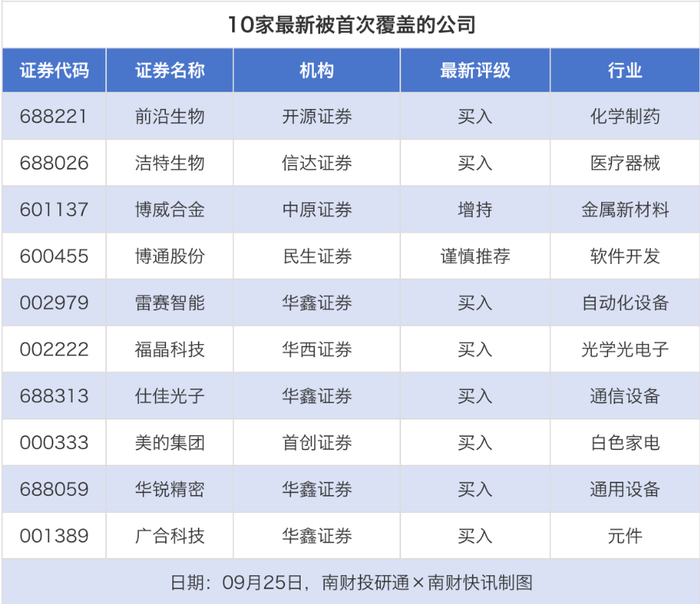 首次覆盖方面,9月25日券商共给出了10次首次覆盖,其中前沿生物获得开源证券给予“买入”评级,洁特生物获得信达证券给予“买入”评级,博威合金获得中原证券给予“增持”评级,博通股份获得民生证券给予“谨慎推荐”评级,雷赛智能获得华鑫证券给予“买入”评级。