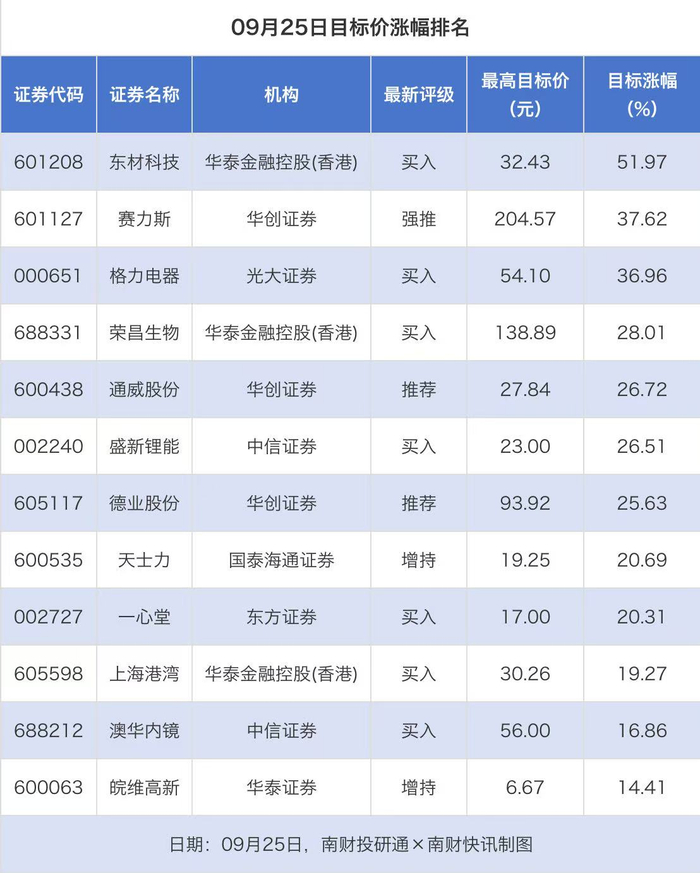 南财投研通数据显示,9月25日,券商给予上市公司目标价共12次,按最新收盘价计算,目标价涨幅排名居前的公司有东材科技、赛力斯、格力电器,目标价涨幅分别为51.97%、37.62%、36.96%,分别属于塑料、乘用车、白色家电行业。