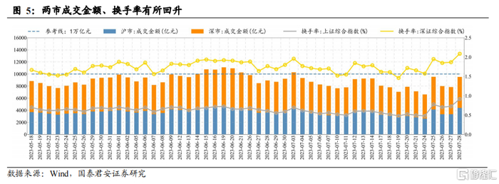 本周(2023-07-24至2023-07-28)行情概况:(1)主要指数:主要宽基指数强势上攻,市场呈现普涨格局。其中,上证50、沪深300等蓝筹指数分别上涨5.49%、4.47%,上证指数、深证成指、创业板指、中证500、中证1000、科创50分别上涨3.42%、2.68%、2.61%、1.98%、1.00%、0.74%。(2)板块观察:券商、地产领涨市场,TMT持续调整。非银行金融、房地产分别上涨11.75%和9.75%;传媒、电子、通信分别下跌-2.91%、-0.65%、-0.48%。(3)市场情绪:成交金额有所回升,股指期货升水收盘。沪深两市日均成交额0.83万亿元,较上周(0.76万亿)有所回升。IF、IH和IC主力合约基差分别为16.46点、10.97点和8.96点。(4)资金流向:两融余额变化较小,北向资金净买入345亿元。最新余额数据(07月27日周四)为1.57万亿元;融资买入占比为6.57%。本周北向资金净买入345亿元:食品饮料、非银行金融、银行、医药、房地产分别净流入70.39、61.34、25.52、20.59、18.82亿元;电子、计算机、国防军工、传媒、电力及公用事业分别净流出-38.52、-19.48、-5.69、-5.01、-4.84亿元。(5)量化“黑科技”:主要指数估值基本合理,创业板指位于估值底部;下跌能量模型显示,市场主要指数下跌能量处于正常水平,尚未触发下跌信号。