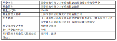 中国经济网北京2月23日讯今日,上海国泰君安证券资产管理有限公司公告,国泰君安中债0-3年政策性金融债增聘基金经理刘明。
