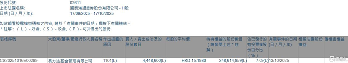 格隆汇10月17日丨根据联交所最新权益披露资料显示,2025年10月13日,国泰海通(02611.HK)获易方达基金管理有限公司在场内以每股均价15.198港元增持444.86万股,涉资约6761万港元。