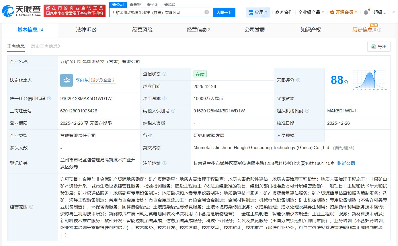 每经AI快讯,天眼查App显示,近日,五矿金川红鹭国创科技(甘肃)有限公司成立,法定代表人为李向东,注册资本1亿元人民币,经营范围包括金属与非金属矿产资源地质勘探、矿产资源勘查、地质灾害治理工程勘查、地质灾害危险性评估等。股东信息显示,该公司由五矿集团国创中心科技(湖南)有限公司、金川集团股份有限公司、白银有色(601212)共同持股。
