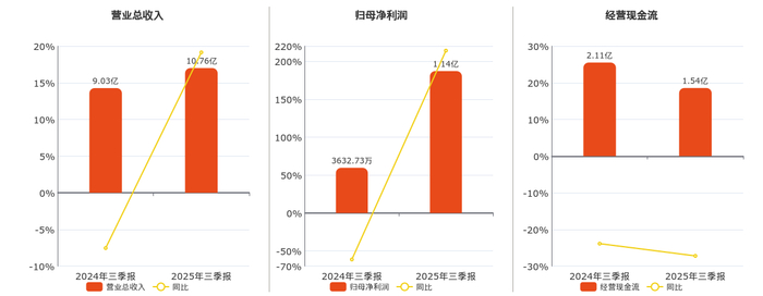 公司营业总收入为10.76亿元,在已披露的同业公司中排名第14。归母净利润为1.14亿元。经营活动现金净流入为1.54亿元,较去年同报告期经营活动现金净流入减少5742.68万元,同比较去年同期下降27.21%。