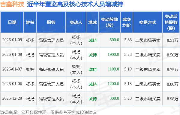 吉鑫科技:1月9日高管杨扬减持股份合计500股