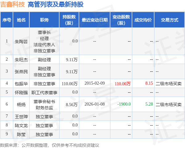 吉鑫科技的高管列表及最新持股情况如下: