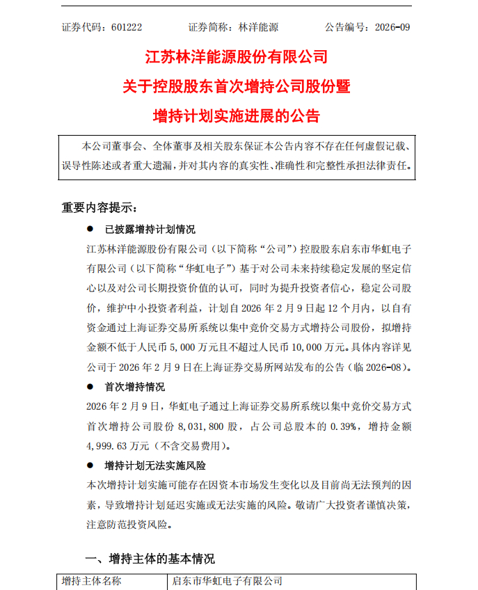 2月9日林洋能源关于控股股东首次增持公司股份暨增持计划实施进展的公告截图此次系列举措被市场视为公司在业绩调整期主动稳定预期、强化价值沟通的实质性行动。“2026年是业务攻坚的关键之年,将通过扎实经营与有效的资本举措,驱动内在价值与市场价值共同提升。”林洋能源有关人士表示。