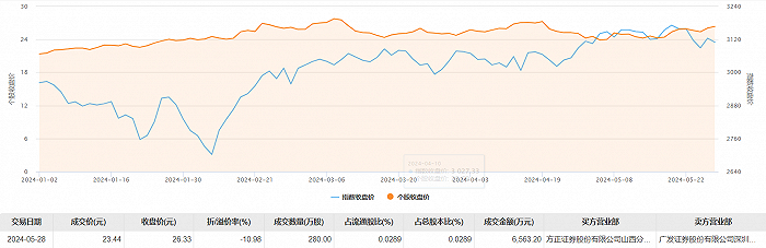 5月28日大宗交易成交280万股,成交额6563.2万元,占当日总成交额的9.03%,成交价23.44元,较市场收盘价26.33元折价10.98%。
