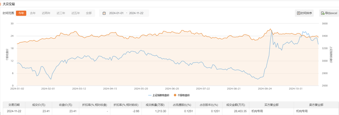 今日大宗交易成交1213.3万股,成交额2.84亿元,占当日总成交额的23.83%,成交价23.41元,较市场收盘价持平。