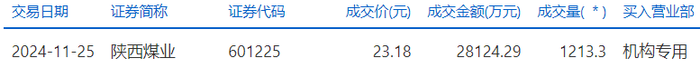 陕西煤业今日大宗交易成交1213.3万股,成交额2.81亿元