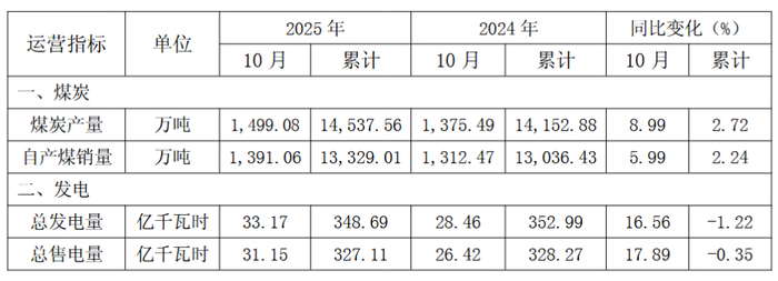 11月7日,陕西煤业(601225)发布公告,2025年10月主要运营数据显示,煤炭产量为1499万吨,同比增长8.99%;自产煤销量1391万吨,同比增长5.99%。