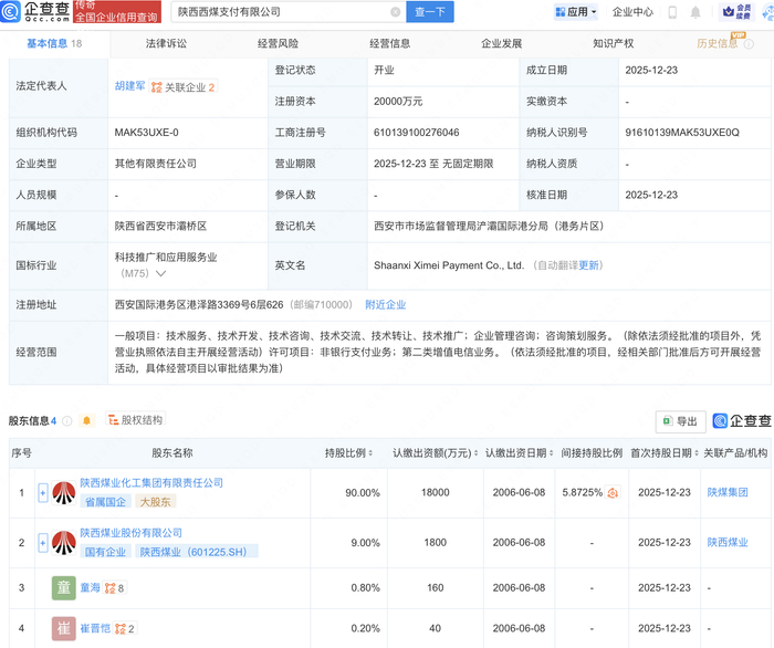 APP显示,近日,陕西西煤支付有限公司成立,注册资本2亿元,经营范围包含:非银行支付业务;第二类增值电信业务等。企查查股权穿透显示,该公司由陕西煤业(601225)等共同持股。