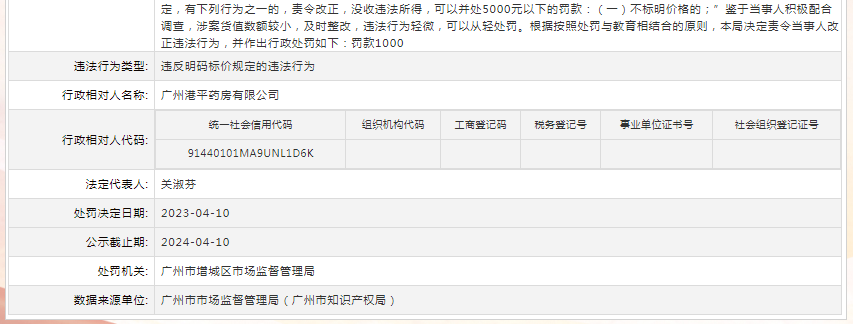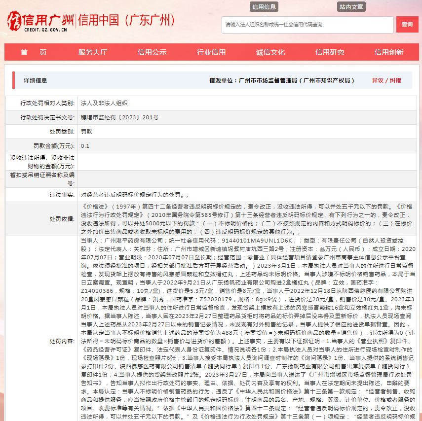 关于对广州港平药房有限公司行政处罚信息(穗增市监处罚〔2023〕201号)